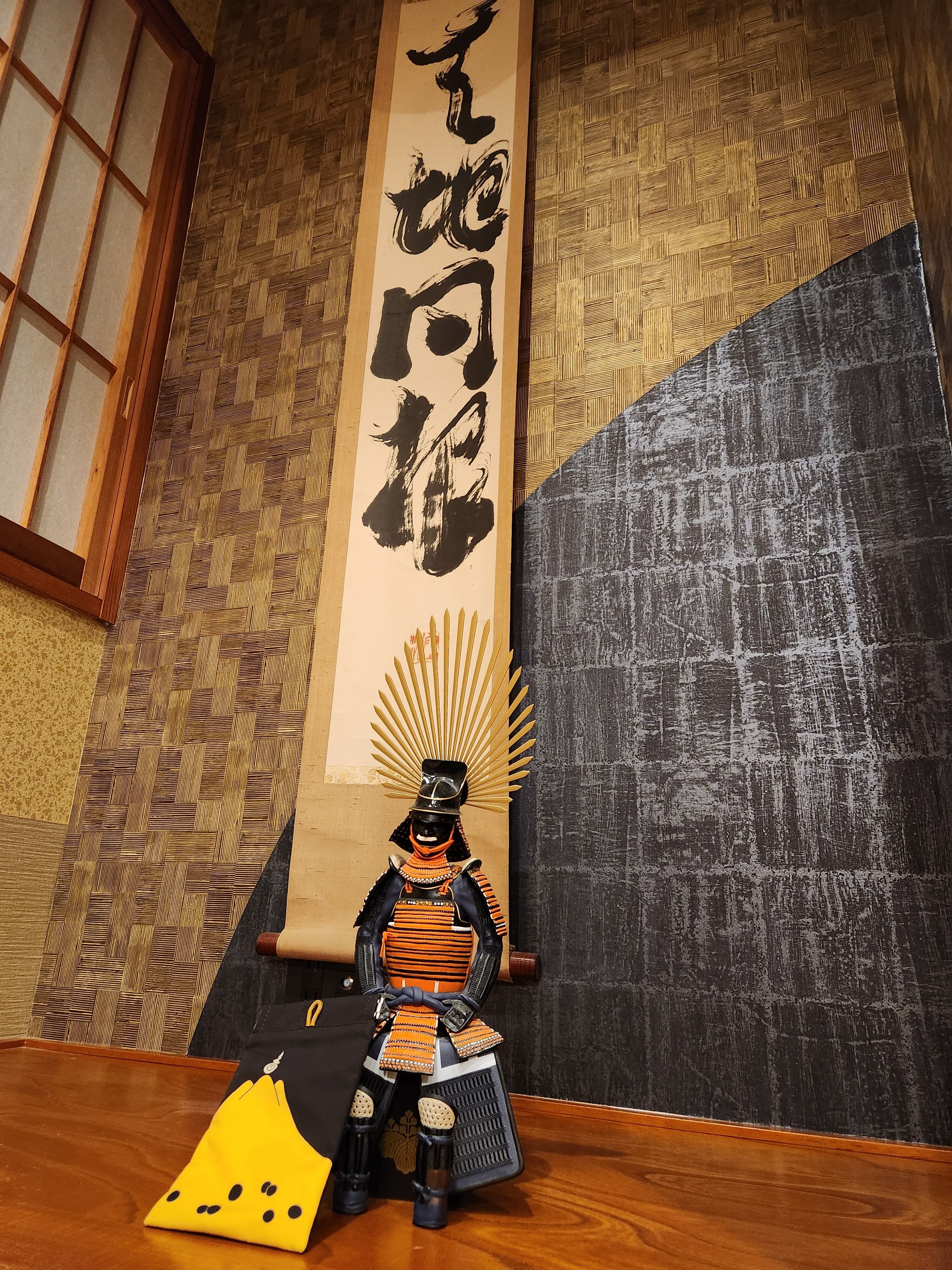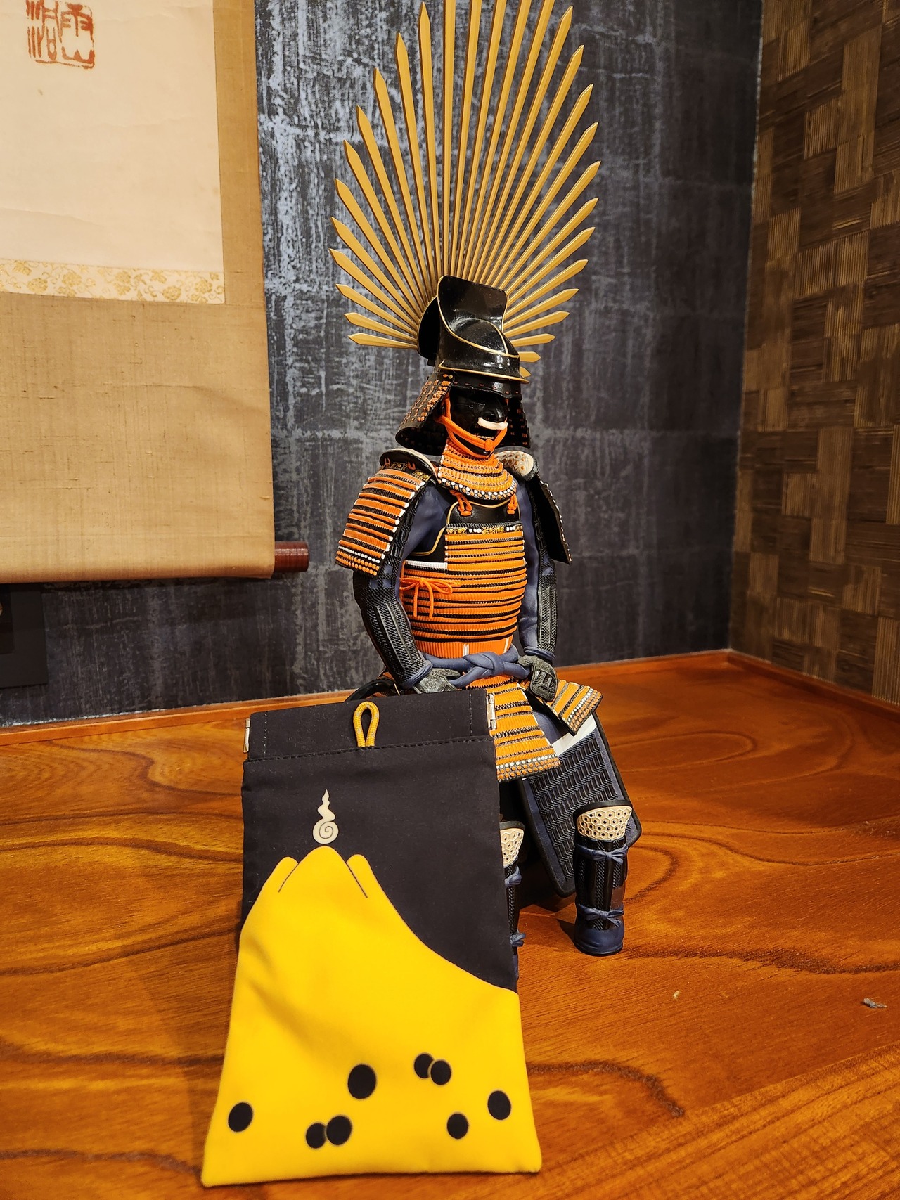 豊臣秀吉公の陣羽織「富士御神火文黒黄羅紗陣羽織」を模した携帯式のゴミ箱です